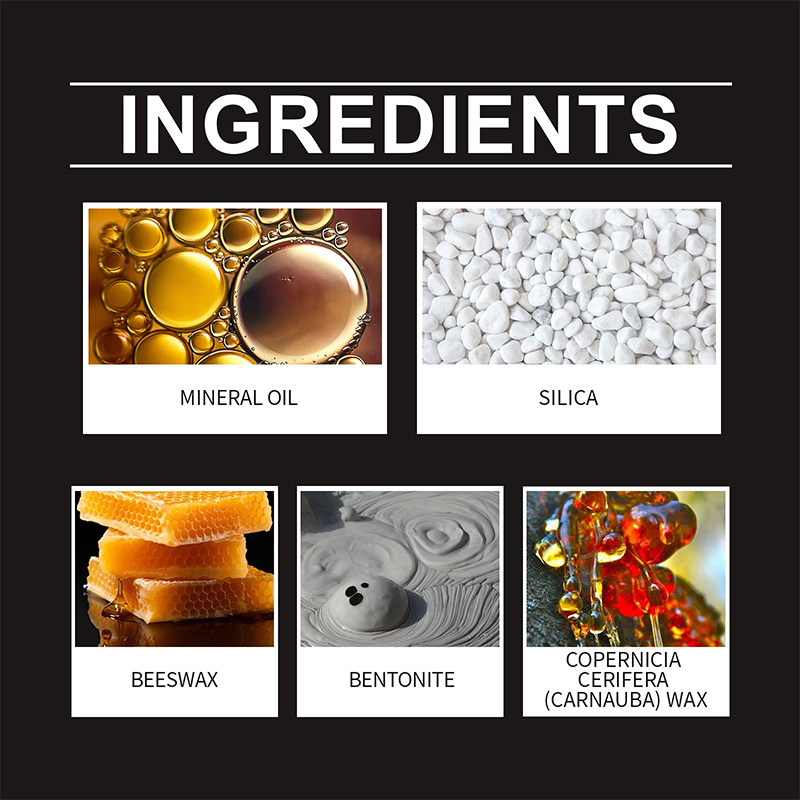 Ingredients: Mineral oil, Silica, Beeswax, Bentonite, Carnauba wax